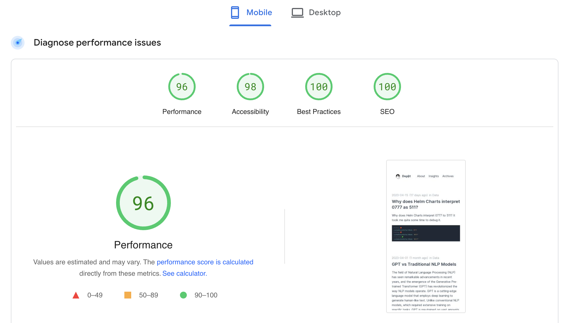 Last but not least, the Pagespeed Insights score still remains high, as you can see in this analysis: https://pagespeed.web.dev/analysis/https-blog-duyet-net/yosvr0e3d0?form_factor=mobile
