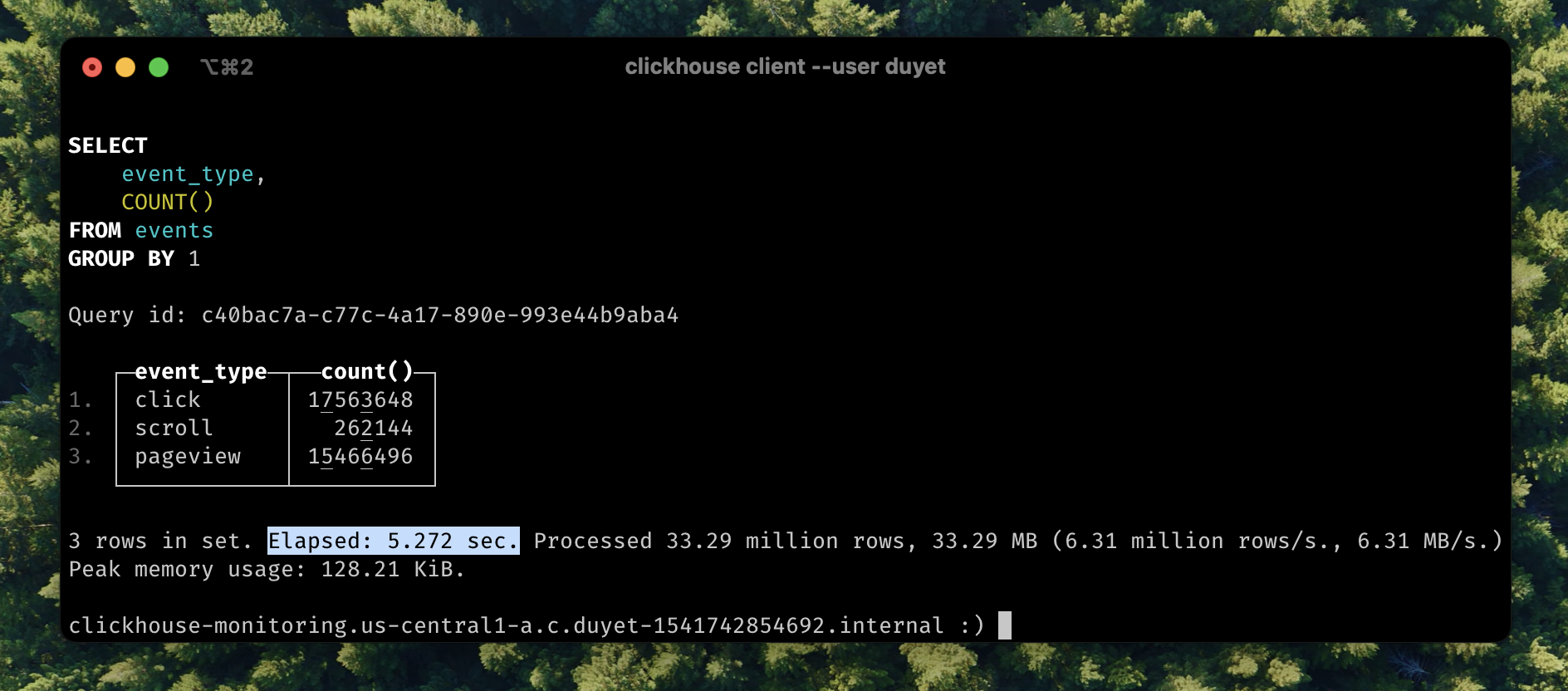 + 3 rows in set. Elapsed: 5.272 sec. Processed 33.29 million rows, 33.29 MB (6.31 million rows/s., 6.31 MB/s.)