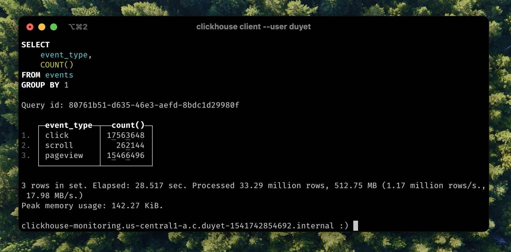 3 rows in set. Elapsed: 28.517 sec. Processed 33.29 million rows, 512.75 MB (1.17 million rows/s., 17.98 MB/s.)