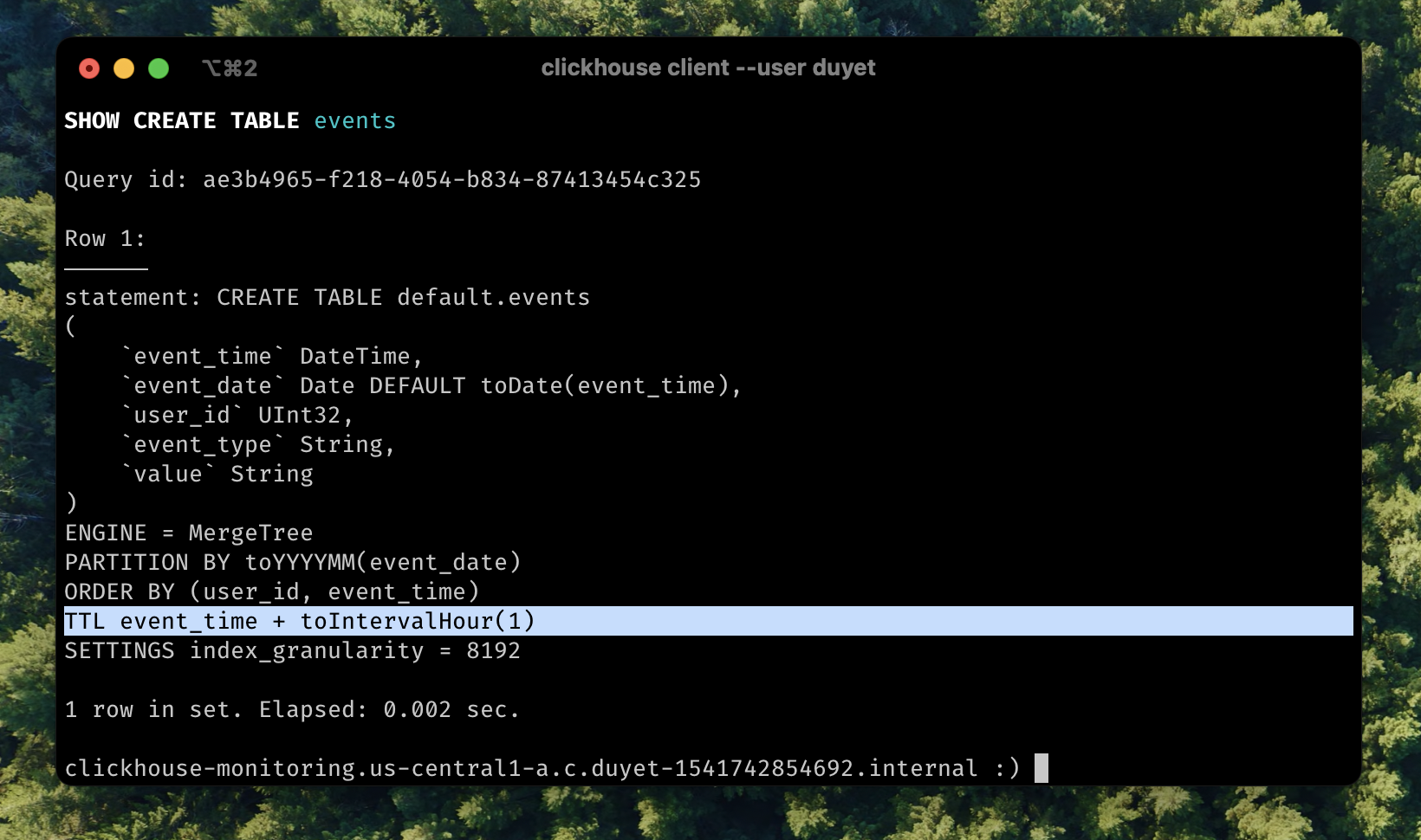 ALTER TABLE events MODIFY TTL event_time + INTERVAL 1 HOUR;