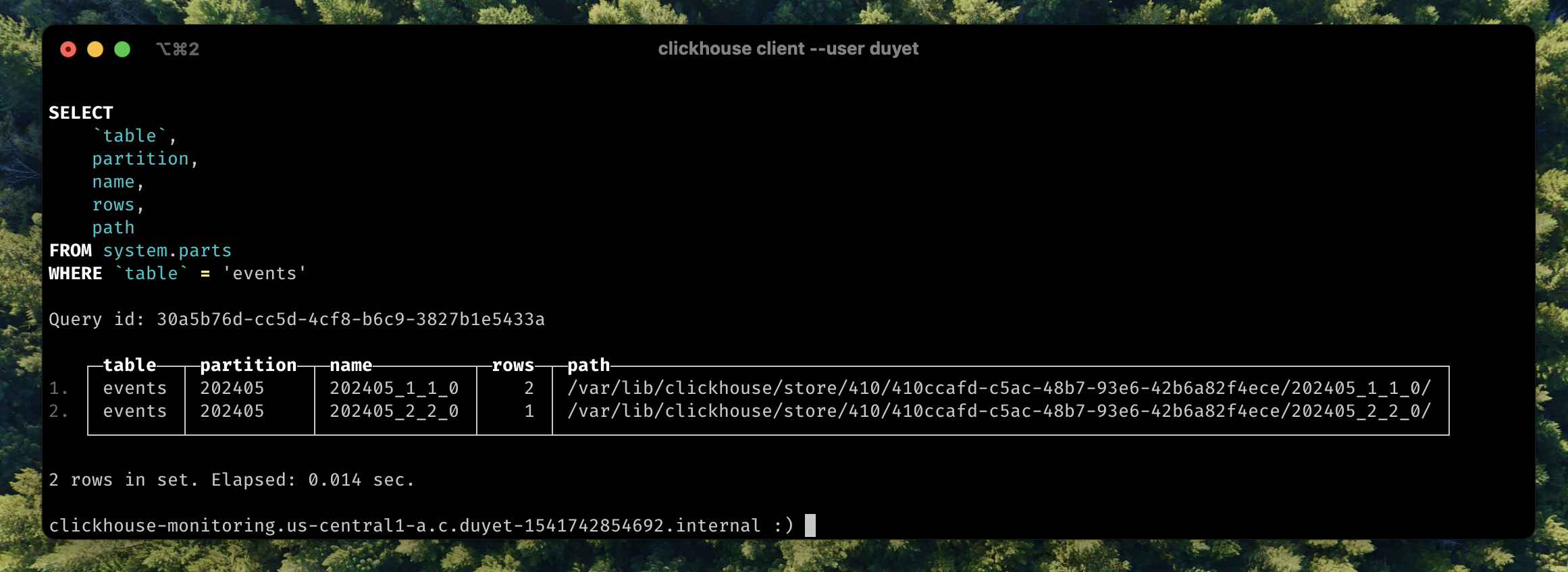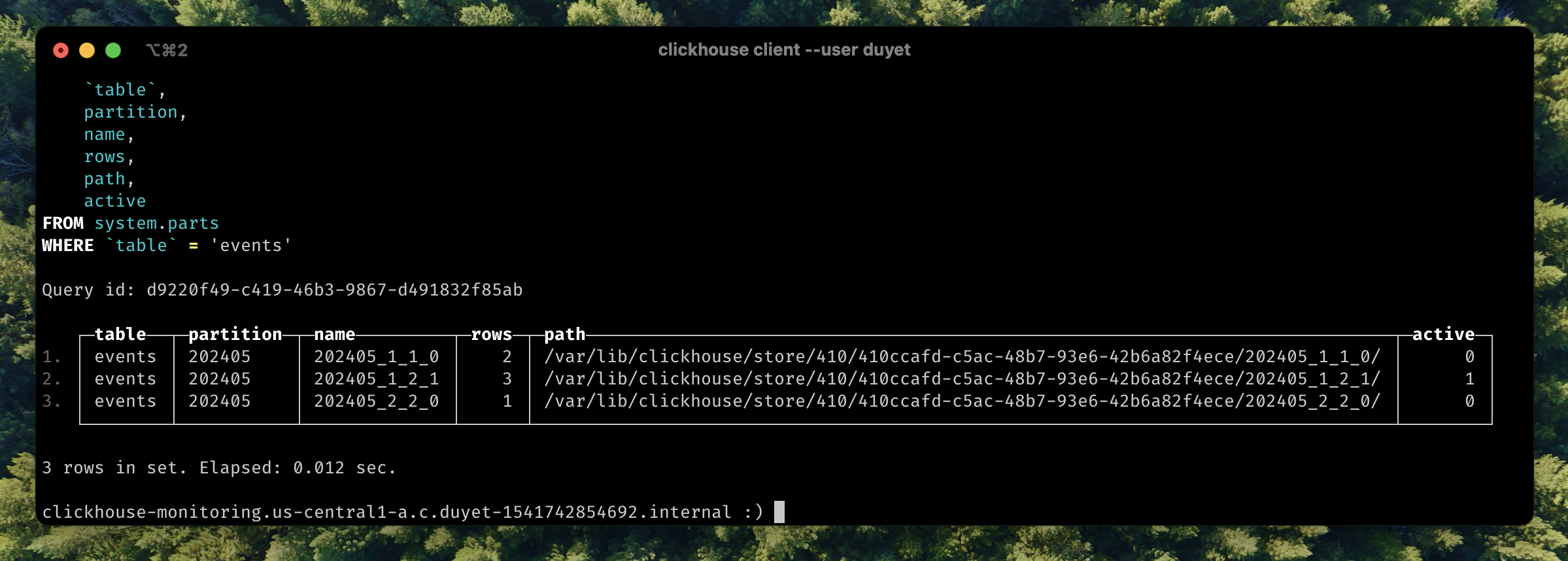 │ events │ 202405 │ 202405_2_2_0 │ 1 │ /var/lib/clickhouse/store/410/410ccafd-c5ac-48b7-93e6-42b6a82f4ece/202405_2_2_0/ │